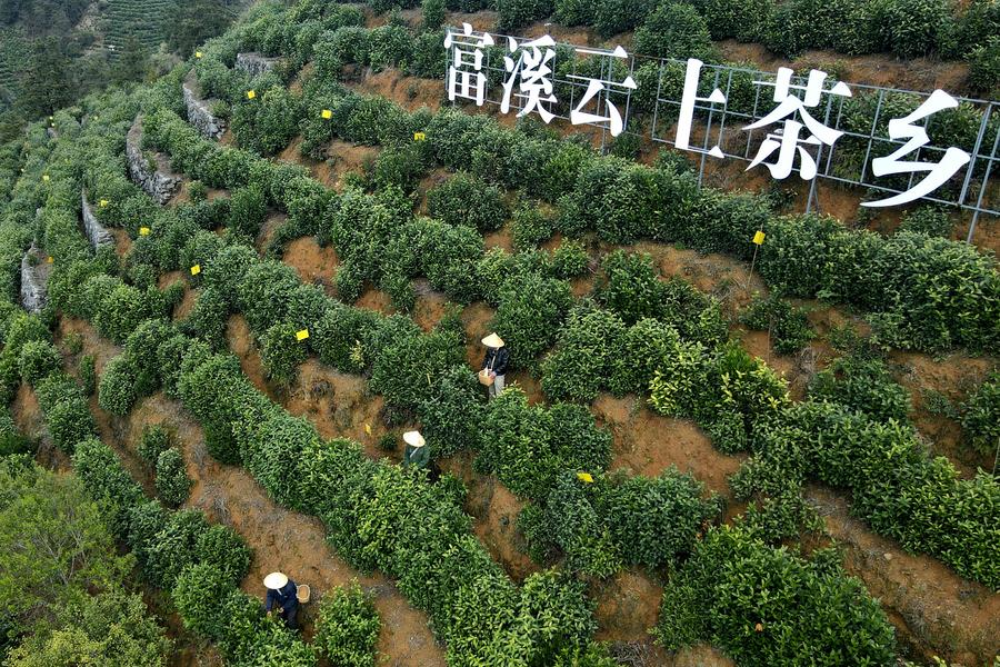 A drone photo shows farmers picking tea leaves at a tea garden in Fuxi Township in Huangshan City, east China's Anhui Province, March 28, 2024. (Xinhua/Huang Bohan)