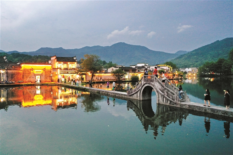 The night fell and the lights lit up in Hongcun Village. In the scenic spot of Hongcun in Yi County, the ancient Hui-style architecture and bright lights complement each other with endless beauty, attracting many tourists to come for sightseeing and summer leisure.