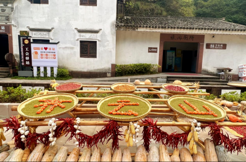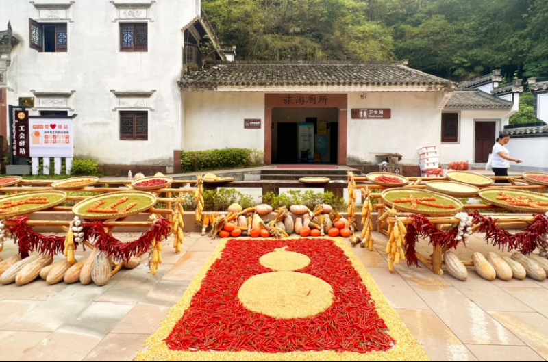 The Qiyun Mountain Scenic Area in Xiuning County unveiled a unique "Autumn Harvest Display" landscape, with crops such as chili peppers, corn, and pumpkins laid out to dry in front of and behind houses, spreading the joy of harvest across the mountainside.
