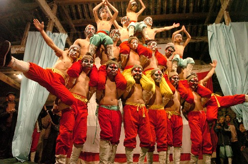 【叠罗汉】 流行于歙县叶村的一种民间游艺。表演时演员下穿红彩裤,上身赤膊光膀,面部绘有脸谱。演员均为男性,表演浑朴粗犷。演出前举行祭台仪式,焚纸烧香、罗汉扫堂,然后从演员相继登台或在广场上表演。演员不说不唱,在大鼓敲击的简单节奏下,分别表演童子拜观音、斜角旗、仙人桥、石猴出山、六柱牌坊、凉心水阁、水帘洞、刘海戏金蟾等造型。表演时先易后难,特别是水帘洞中演员的筋斗及六柱牌坊20余位演员叠成的六层造型,最为精彩。