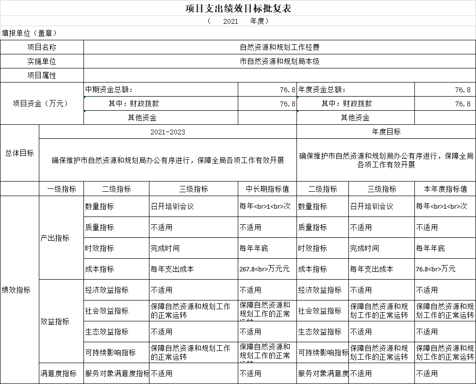 2021年度项目支出绩效目标批复表(自然资源和规划工作经费)