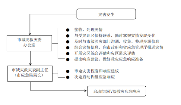 灾害发生后,市减灾救灾委办公室在接到灾情报告后经分析评估,认定灾情达到启动标准,向市减灾救灾委提出启动Ⅰ级响应的建议,按照市政府决定,启动Ⅰ级响应,并向省减灾委报告。