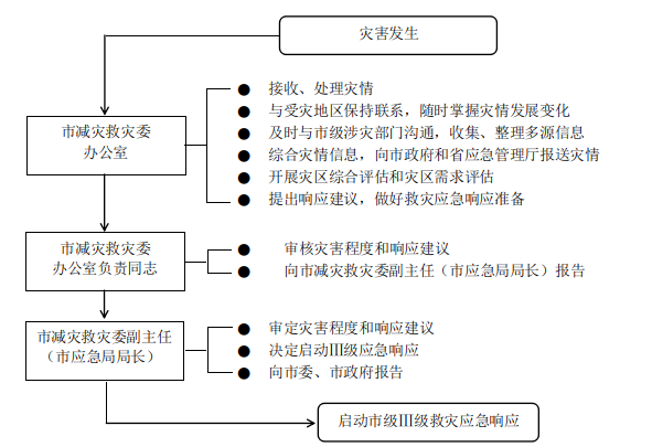 灾害发生后,市减灾救灾委办公室在接到灾情报告后经分析评估,认定灾情达到启动标准,向市减灾救灾委提出启动Ⅲ级响应的建议,由市减灾救灾委副主任(市应急局局长)决定启动Ⅲ级响应,并向市委、市政府和省减灾委报告。
