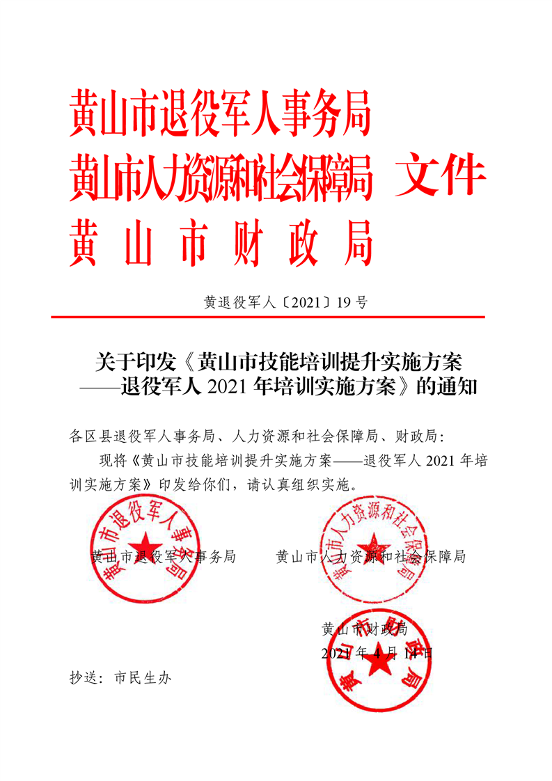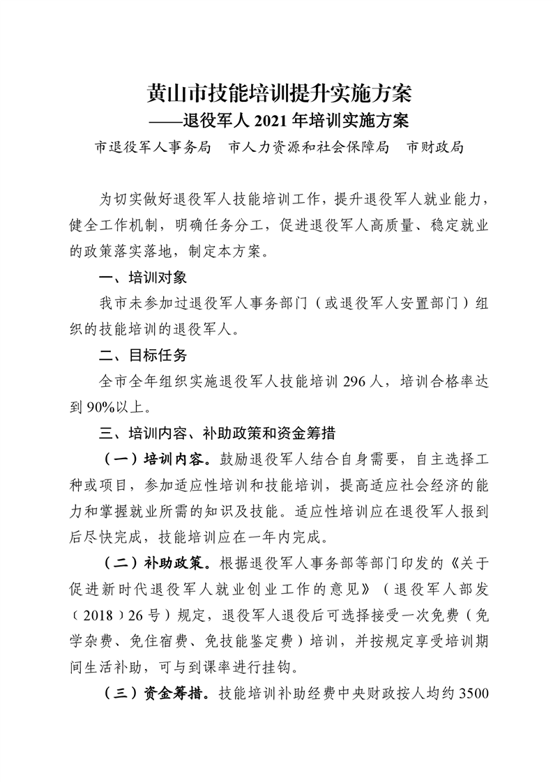 关于印发《黄山市技能培训提升实施方案——退役军人2021年培训实施方案》的通知