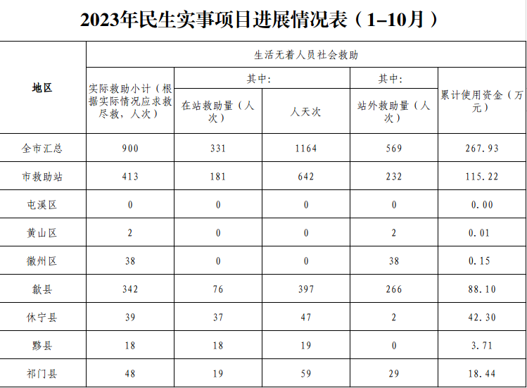 黄山市2023年1-10月生活无着人员社会救助月报表