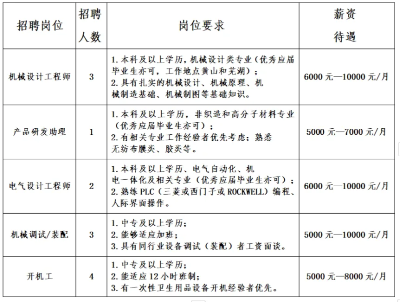 单位简介:黄山富田精工智造股份有限公司成立于2010年12月,位于黄山高新区,注册资金6000万元,现有员工230余人, 是一家专业从事一次性卫生用品智能装备研发、设计、制造及销售为一体的高端装备制造企业。富田精工是国家级专精特新“小巨人”企业、全国防疫物资重点保障企业、国家知识产权优势企业、安徽省技术创新示范企业,建设有中国一次性卫生制品装备产业链协同创新中心、安徽省企业技术中心、安徽省工业设计中心。