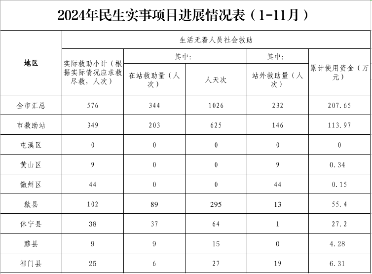黄山市2024年1-11月生活无着人员社会救助月报表