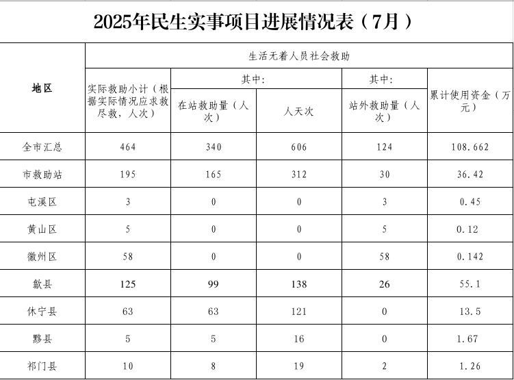 黄山市2025年1-7月生活无着人员社会救助月报表