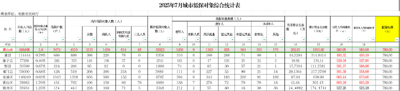 黄山市城市低保2025年7月统计表(分区县)