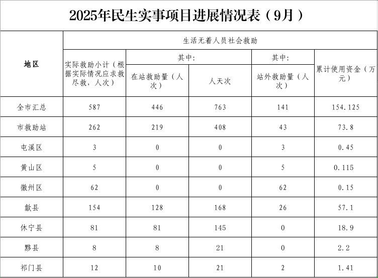 黄山市2025年1-9月生活无着人员社会救助月报表
