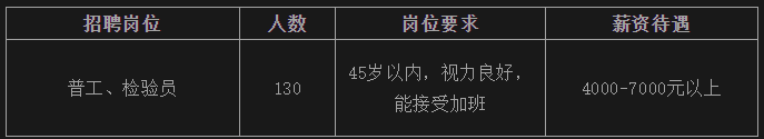 公司福利:五险一金、月休6天、工作餐、员工宿舍、满勤奖、工龄奖、生日券、年终奖等福利;公司环境优越,一经录用,待遇从优,每年根据能力提薪。联系人: 宋主管 汪经理联系电话: 18726830315 15055992397 (均微信同步)地 址:黄山高新区梅林大道87号(屯溪乘坐21路、休宁乘坐1路或106路、岩寺乘坐32路公交车直达)