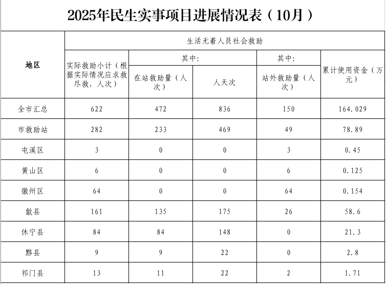 黄山市2025年1-10月生活无着人员社会救助月报表