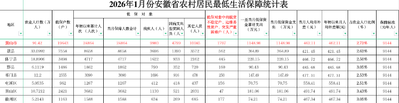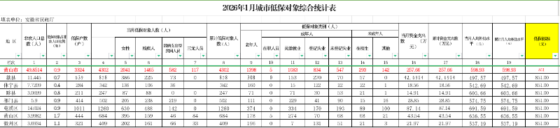 黄山市城乡低保2026年1月统计表(分区县)