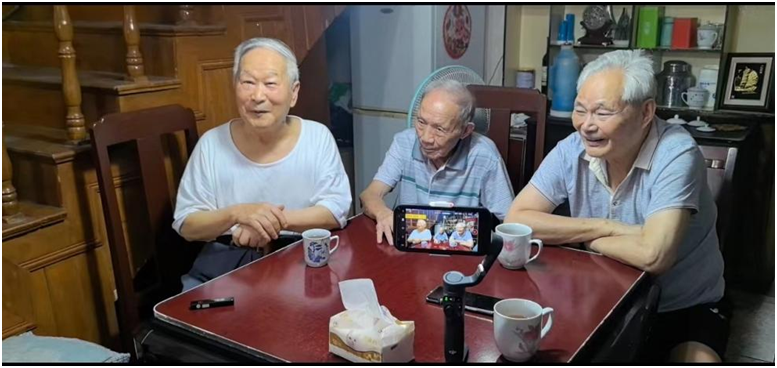 未入家门,三位老兵已开始寒暄,应是许久未见的缘故,三老显得格外激动,在门口便紧紧握住了彼此的手,眼眶泛红,仿佛瞬间回到了那些年共同奋斗的岁月(如图1)。张脉贤老先生率先打破沉默,开始娓娓道来:“昔日,我等皆因响应党的召唤,毅然投身军旅。彼时,正值对抗美国之际,原子弹的威胁非同小可。然当时社会广泛宣传,原子弹并不可怕,真正决定战争胜负的乃是人而非武器。基于此信念,我们积极自愿入伍,只为保卫祖国和平安宁。”