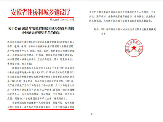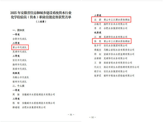 近日,黄山市生态环保集团(水务集团)收到安徽省住房和城乡建设厅《关于公布2025年安徽省住房和城乡建设系统职业技能竞赛获奖名单的通知》,环保(水务)集团在代表黄山市参加的2025年全省住房和城乡建设系统供水行业化学检验员(供水)职业技能竞赛中,荣获团体二等奖,参赛选手汪蔚、陈昊分别斩获个人三等奖与优秀奖。