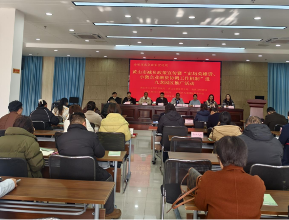 中国银行黄山分行、徽商银行黄山分行、邮储银行屯溪支行分别宣讲“亩均英雄贷”金融产品支持优惠政策;中国人民健康保险黄山分公司、平安财险黄山分公司分别宣讲企业保险有关政策。
