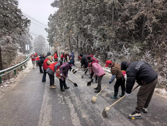 闻雪而动,争当除冰“先锋队”。1月21日晨间,降雪范围持续扩大,农村公路部分路段积雪厚度逐渐增加。随着集结令响起,各应急抢险队伍迅速分赴责任区域。针对农村公路点多、线长、面广的特点,采取“机械主攻、人工补位”的协同模式:铲雪车、撒布机在主干道来回作业,高效清除路面积雪;人工队伍紧随其后,对机械难以覆盖的急弯、陡坡、桥梁接缝等关键部位,精准撒布融雪剂、铲除薄冰。在黟县茅山岭、祁门县洪祁路等山区路段,党员突击队率先垂范,顶着刺骨寒风挥锹铲雪,手冻得通红却始终坚守岗位;部分临水临崖路段出现树木倒伏险情,抢险人员手拖肩扛清理断枝,快速打通通行通道。