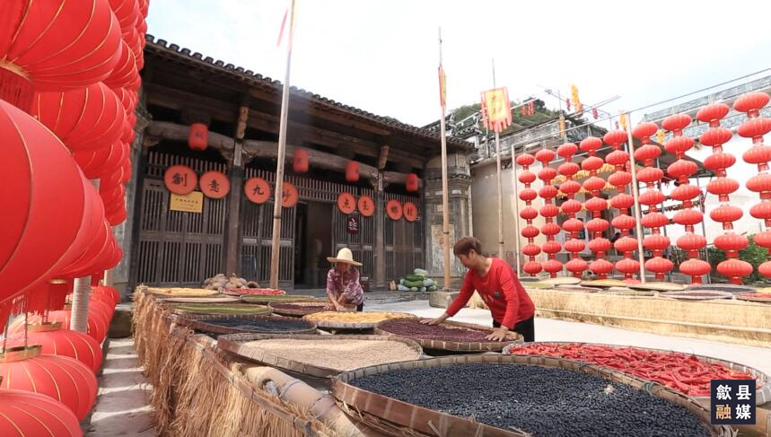 九砂村依山傍水,新安江从村前流过。九砂村的村民们将收获的玉米、黄豆、辣椒等五彩缤纷的果实拼出各种图案,因地制宜晾晒在广场空地上。