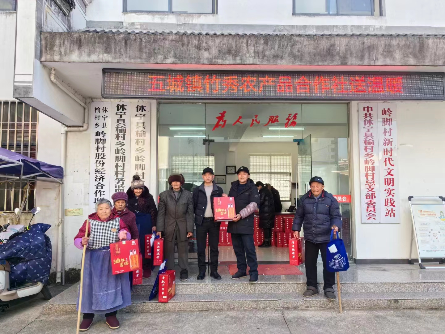 1月11日上午,榆村乡岭脚村党群服务中心内一派喜庆,来自五城镇竹秀农产品加工合作社负责人正逐一地给当地75岁以上老人发放一盒“徽源芳”菜籽油,拿到礼物的老人们都露出开心的笑脸。