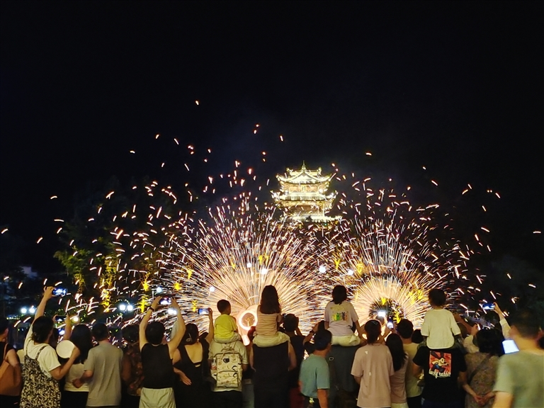 8月3日晚,休宁县齐云山镇热闹非凡,非遗传播UP主“南翔不爱吃饭”现场表演非遗绝技“炭花舞”。表演者迈着刚劲又灵动的舞步,时而闪转腾挪,时而抛甩抖绕,炭花灯笼如金龙翻滚,千姿百态,吸引6000余名市民游客到场观看。