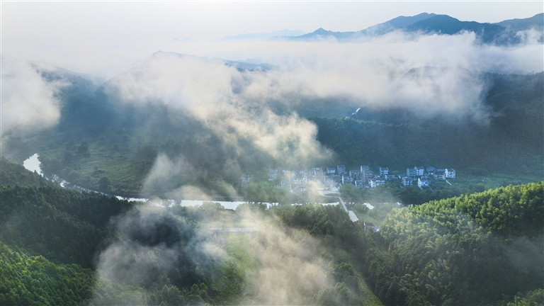 8月23日清晨,新安江源头休宁县流口镇境内,红日破晓,白云悠悠,蓝天之下,青山欲滴,率水河如一条玉带萦绕村庄,给世人呈上一幅绝美的生态图景。