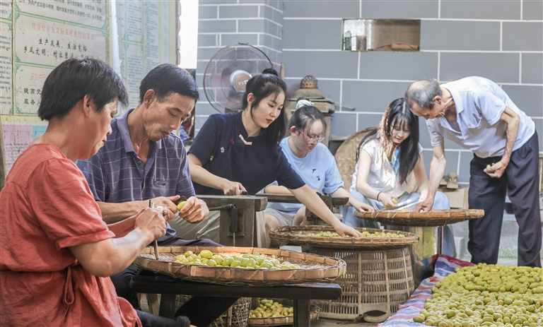 8月26日,歙县三阳镇中村村民采摘成熟的马枣,用传统技艺制作金丝琥珀蜜枣。村民选用个大、肉厚、皮薄的当地产优质马枣为原料,经过清洗、切枣、熬煮、烘干等多道工序,制成的蜜枣金丝缕缕、色如琥珀,遂称金丝琥珀蜜枣。