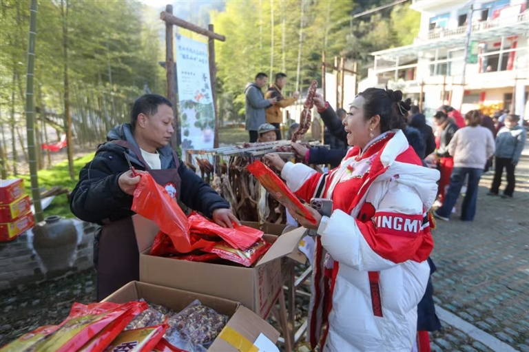 11月30日,徽州区杨村乡“榧翠山口”山货节拉开帷幕。山货市集上,香榧、茶叶、土猪肉、干笋、腊肉等特色农产品琳琅满目,现场还开展了徒手剥香榧、夹黄豆、套圈赢蔬果等互动项目,吸引大量市民游客参与。