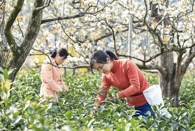 4月3日,梨园内,党员志愿者和茶农抢抓时节,忙着采摘春茶。
