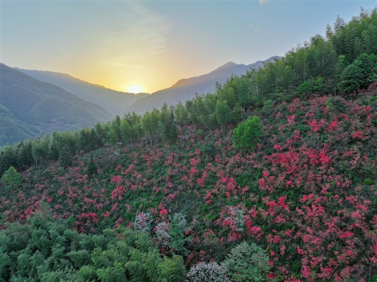 4月17日,休宁县五城镇阳台村的高山野生杜鹃迎来最佳观赏期。粉红、玫红的花朵点缀在青山翠谷间,宛如给群山披上了一件绚丽的春装。