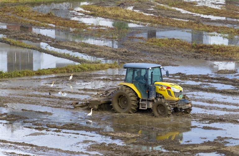 7月12日,在屯溪区黎阳镇新江村的农田里,村民驾驶农机翻耕农田,泥土翻涌间,成群的鹭鸟翩然飞舞、穿梭觅食,勾勒出人与自然和谐共生的美好画面。