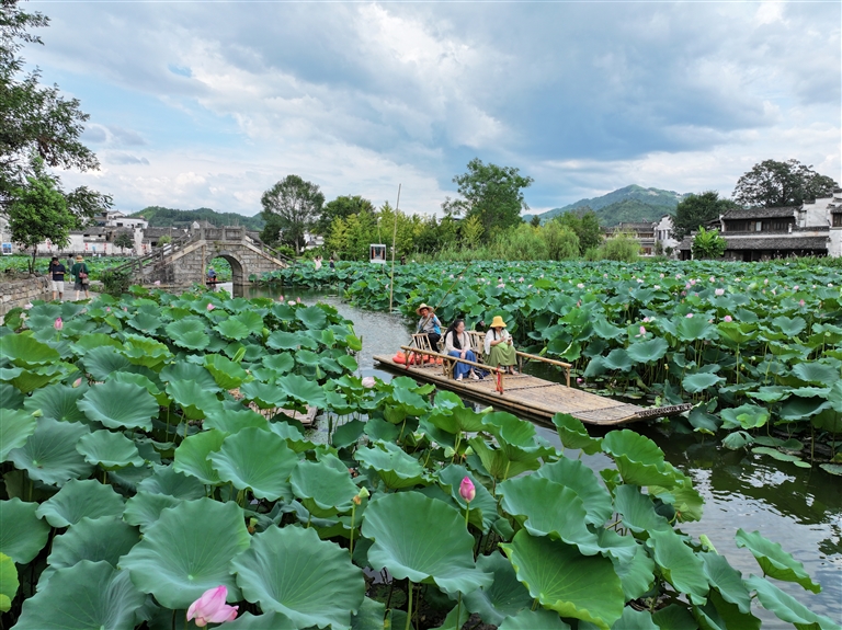 7月25日,徽州区呈坎古村永兴湖,满池荷叶铺展,石桥静卧水上。游客乘竹筏穿梭其间,于绿意中避暑,乐享夏日悠悠时光。