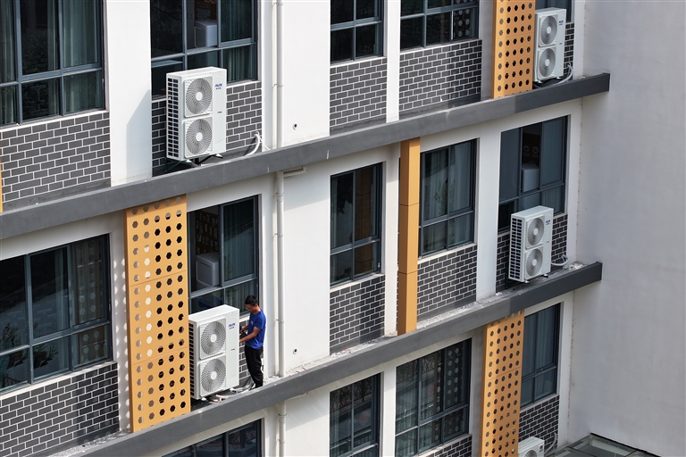 8月11日,在屯溪现代实验学校,安装工人正在加紧调试空调设备。今年暑期,市本级和屯溪区投入资金近1800万元,用于中心城区20所中小学的电力扩容、线路改造和空调安装。目前,各所学校安装工作正有序推进中,预计8月底前全面完成。