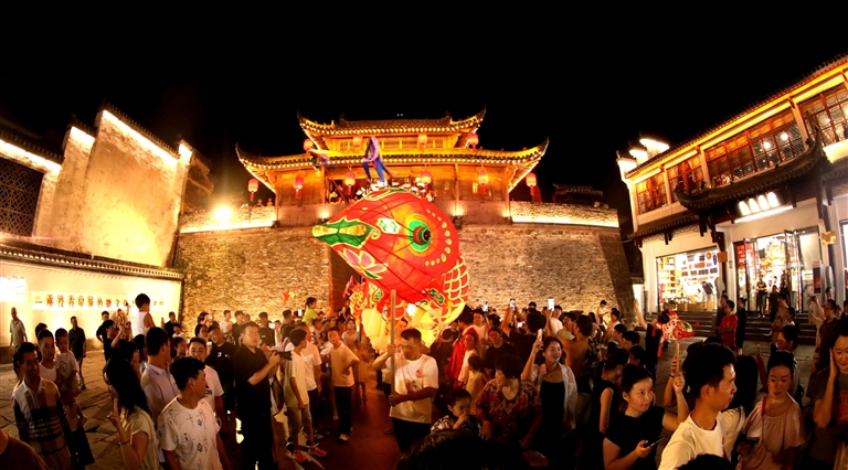 ▶8月16日晚,歙县北岸镇瞻淇村农民进城舞鱼灯,展示非遗“瞻淇鱼灯”。