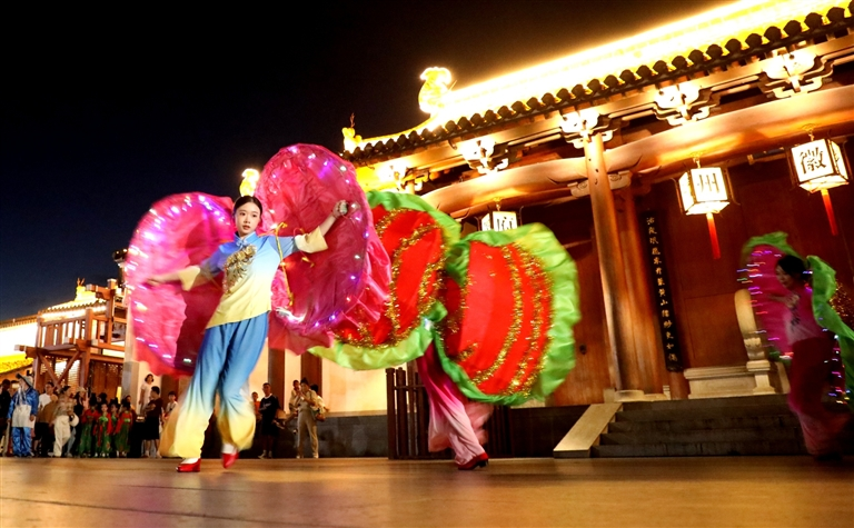 ▲8月14日晚,歙县北岸镇呈村降村农民走进古城,表演非遗“蛤蜊舞”。