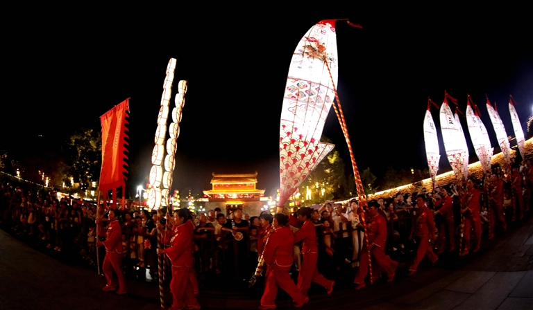 ▲8月19日晚,歙县许村镇许村村农民进城表演非遗“许村大刀灯”。