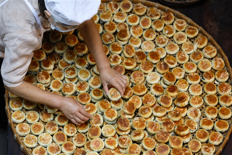 临近中秋,作为传统节日必备糕点,月饼走俏市场。而经过制油酥、擀面皮、包馅、固形、盖印和烘烤等多道古法手工工序制作而成的“徽式麻仁月饼”因外酥里糯、口感鲜美,备受百姓喜爱。