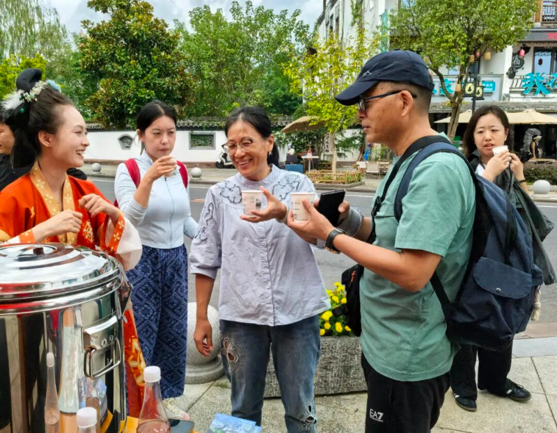 一杯香茶为您解忧。“阿姨,尝尝我们的香风茶,解解渴!”在登封桥附近的免费茶水摊前,志愿者们正将一杯杯热茶递到游客手中。香风茶的清香在唇齿间流转,为游客解渴的同时又舒缓了一身的疲惫。