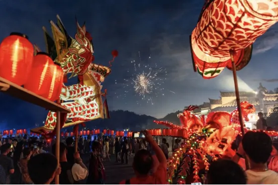 国庆中秋假期,黟县西递景区上演热闹的非遗板凳龙表演。百节板凳首尾相连,缀着百余盏红灯笼,村民舞起板凳龙,在锣鼓声的指挥下,蜿蜒游走于村中小巷,引得游客驻足围观。