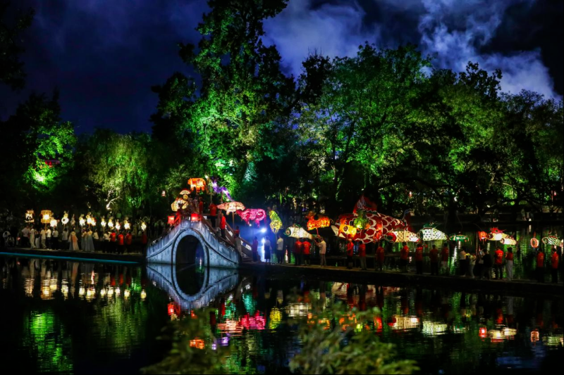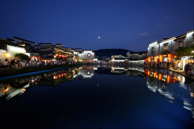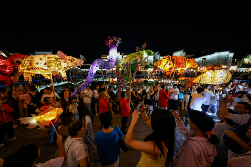 10月5日晚,黟县宏村被流光溢彩的花灯巡游会点亮。月光下,十二生肖、鱼形等造型各异的花灯璀璨移动,月沼之上光影交织,吸引众多游客驻足观赏、拍照,沉浸式感受传统民俗的魅力。