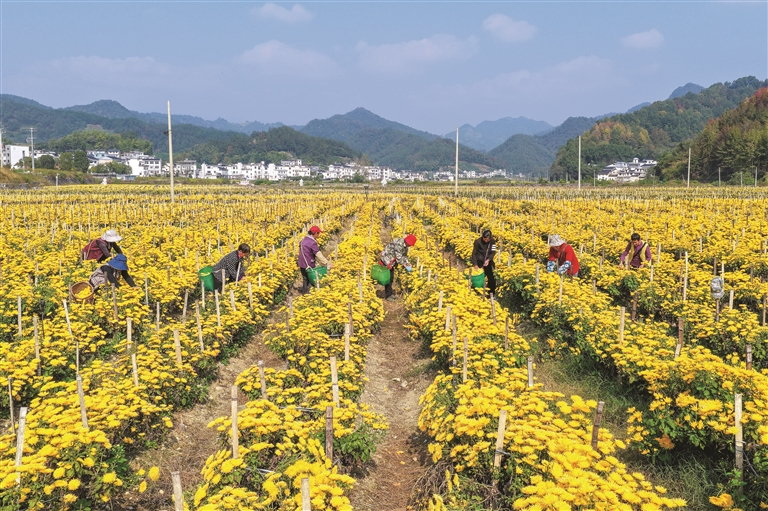 歙县依托土地以及乡村旅游资源,发展观赏性强、经济价值高的金丝皇菊种植,引导企业延长产业链,深加工菊花产品,提高附加值,带动农民增收,推动农旅融合发展。