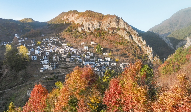 初冬时节,歙县金川乡搁船尖景区层林尽染、色彩斑斓,与白墙黛瓦的村落民居相映成趣,勾勒出一幅绚丽画卷,吸引众多游客前来观光游览。