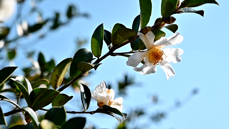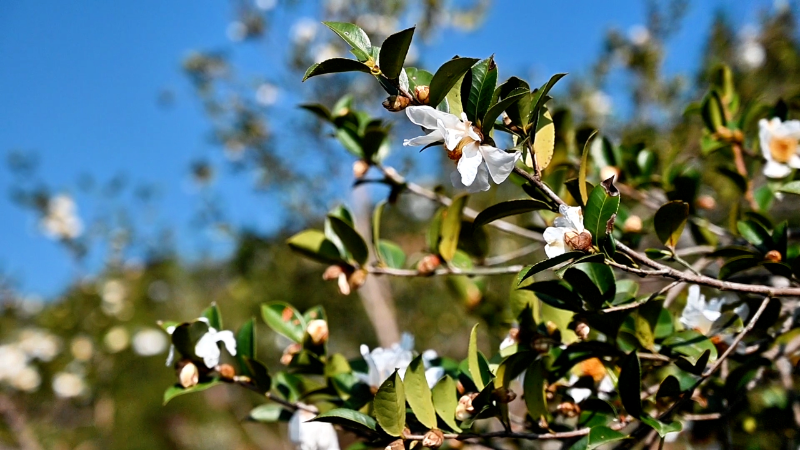 油茶林里“花果同枝”的奇景随处可见,一朵朵油茶花在枝头开得正盛,素白花朵与暗藏的幼果相映成趣,恰好应了“先年花儿多,来年油满锅”的农谚。