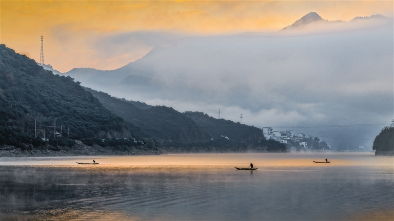 近日,新安江畔歙县深渡镇漳潭村,晨雾如纱裹住山峦,粉墙黛瓦的徽派民居镶嵌在山水间,村民划着小船在金色的江面上游弋,宛如一幅舒展开的水墨画卷。