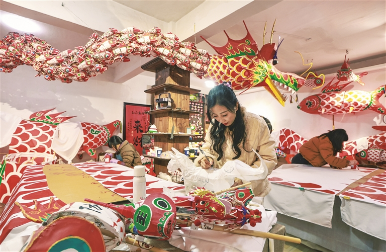 12月25日,在歙县知府非遗鱼灯工坊内,手工艺人正在赶制鱼灯。