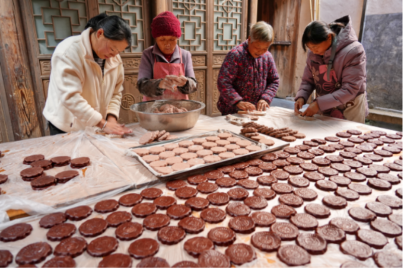 12月25日,在黟县宏村镇际村,村民们聚在一起制作传统食品“食桃”,用美食迎接即将到来的新年。