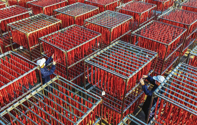 1月8日,在黄山区全江生态农业科技有限公司晒场,工人正在晾晒腌制好的徽州腊味,以供应即将到来的春节市场。