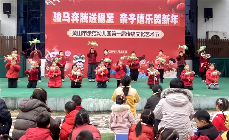 1月28日上午,黄山市示范幼儿园阳湖分园内张灯结彩、笑语盈盈,首届“骏马奔腾送福至 亲子嬉乐贺新年”传统文化艺术节热闹开启。