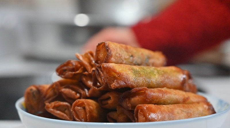 “春卷吃起来香脆可口,吃春卷称为‘咬春’,蕴含着祈求吉祥如意的美好寓意,图个好兆头。”鲍小定介绍说。