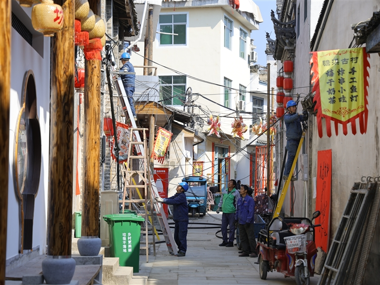 连日来,国网歙县供电公司启动瞻淇村中主干道电缆入地改造工程,以电力赋能千年古村文旅高质量发展。图为2月7日,国网歙县供电公司施工人员在瞻淇村中主干道有序开展旧线路拆除作业。
