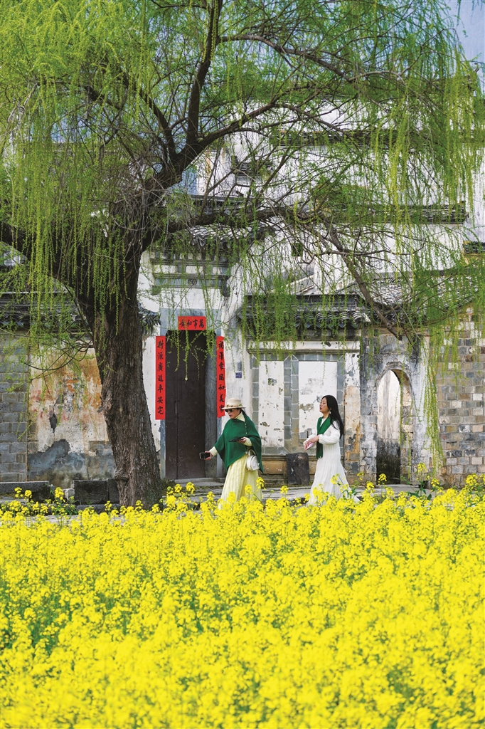 3月17日,黟县关麓村的油菜花盛开。金黄的花海环绕着粉墙黛瓦的徽派古民居,勾勒出一幅浑然天成的田园画卷。
